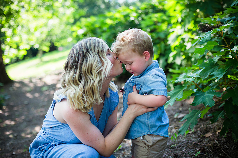 mom kissing little boy on forehead, Cincinnati OH children's photographer