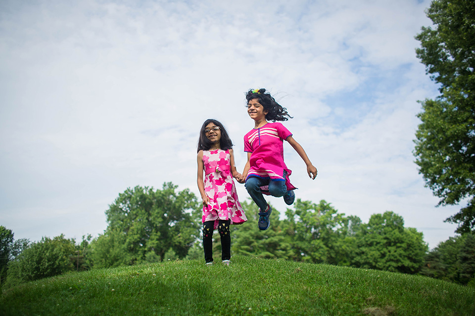 two girls jumping during their family photo session in Blue Ash