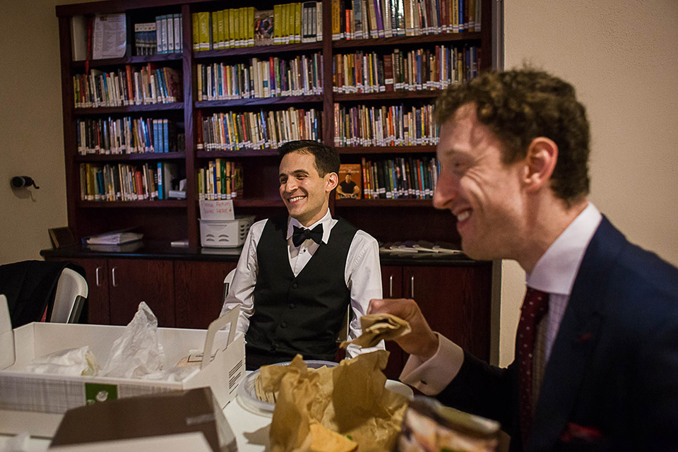 groom getting ready with his groomsmen in church basement