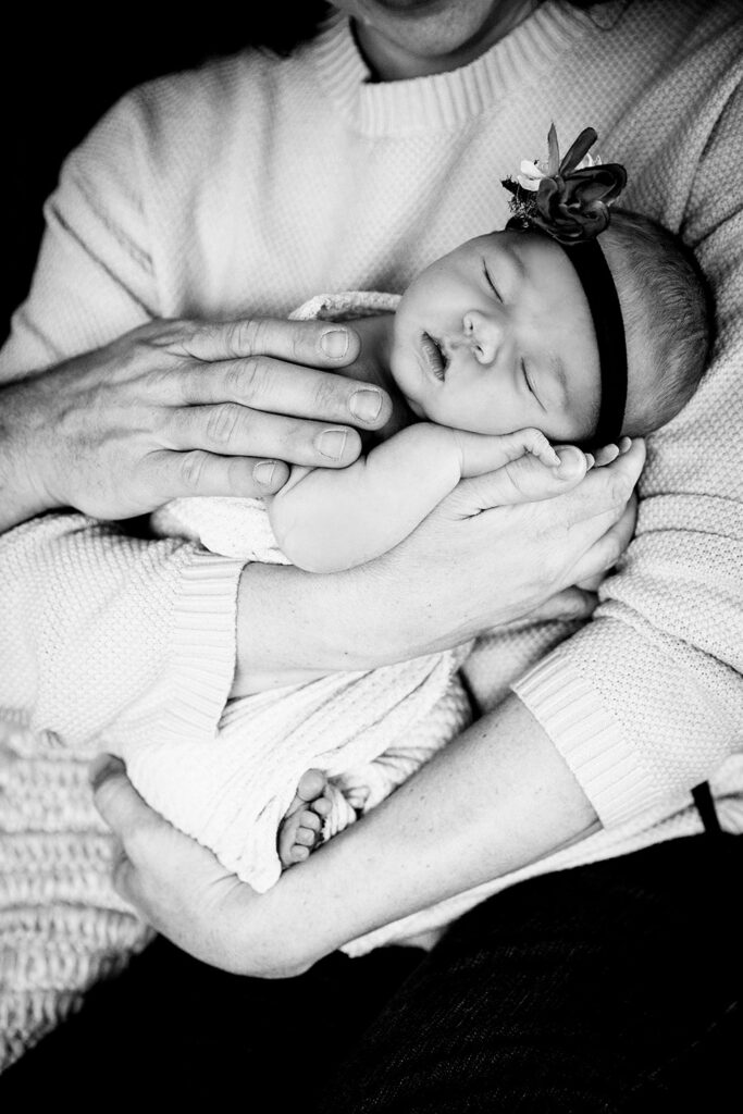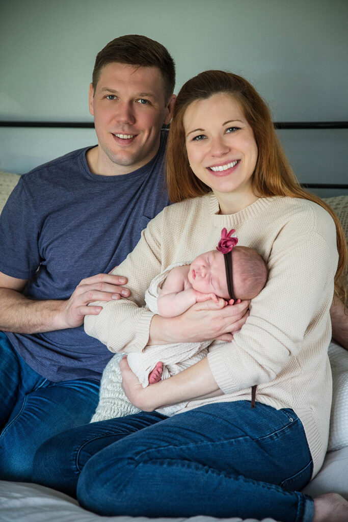 The session started in the master bedroom, where the natural light streaming through the windows created the perfect soft glow. Rose’s parents held her lovingly, surrounded by the cozy charm of their home. The neutral-toned bedding and simple décor provided an ideal backdrop, keeping the focus on their tender connection and Rose’s tiny features.