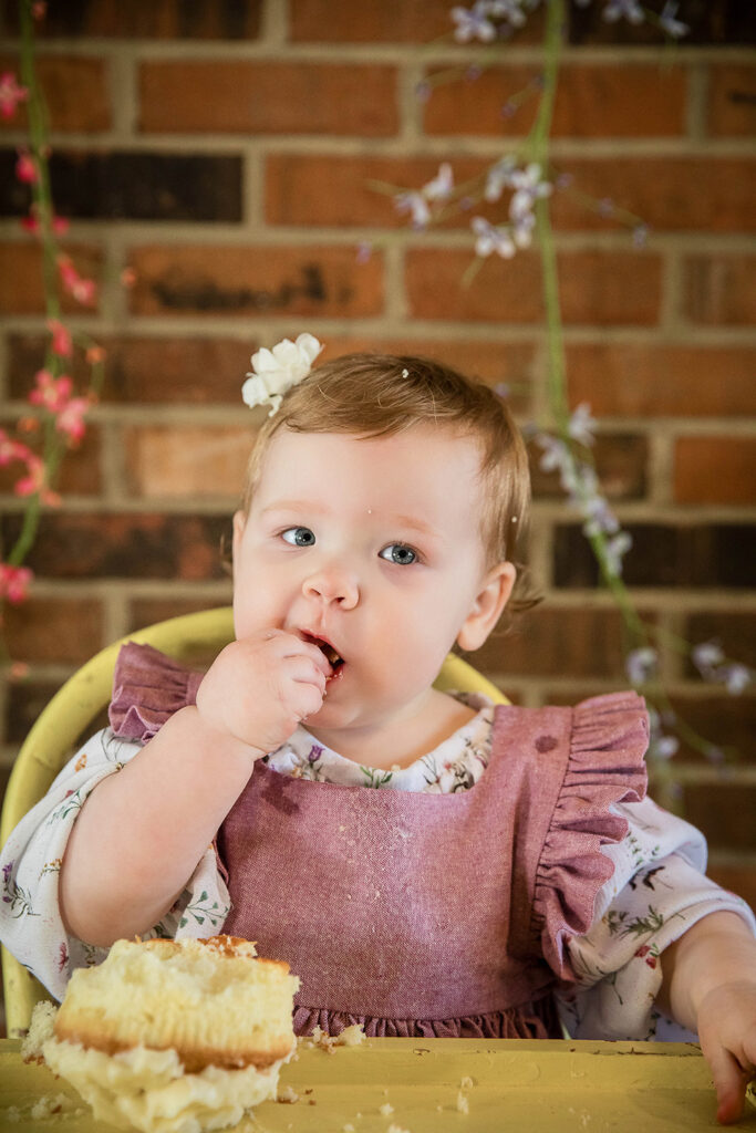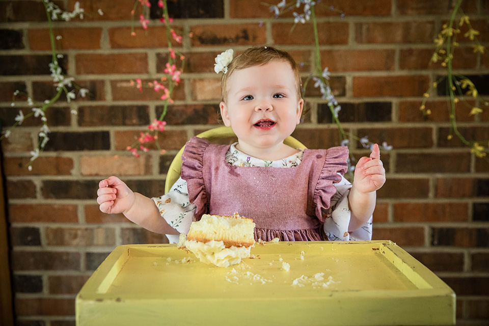 And, of course, no first birthday session is complete without a cake smash! We ended the session with the most delightful setup—a yellow vintage high chair, the perfect pop of color for such a sweet milestone. Her little fingers dug into the frosting, and soon enough, she was covered in sugary happiness. With wide eyes and big, cake-covered smiles, she embraced every moment of the messy fun.