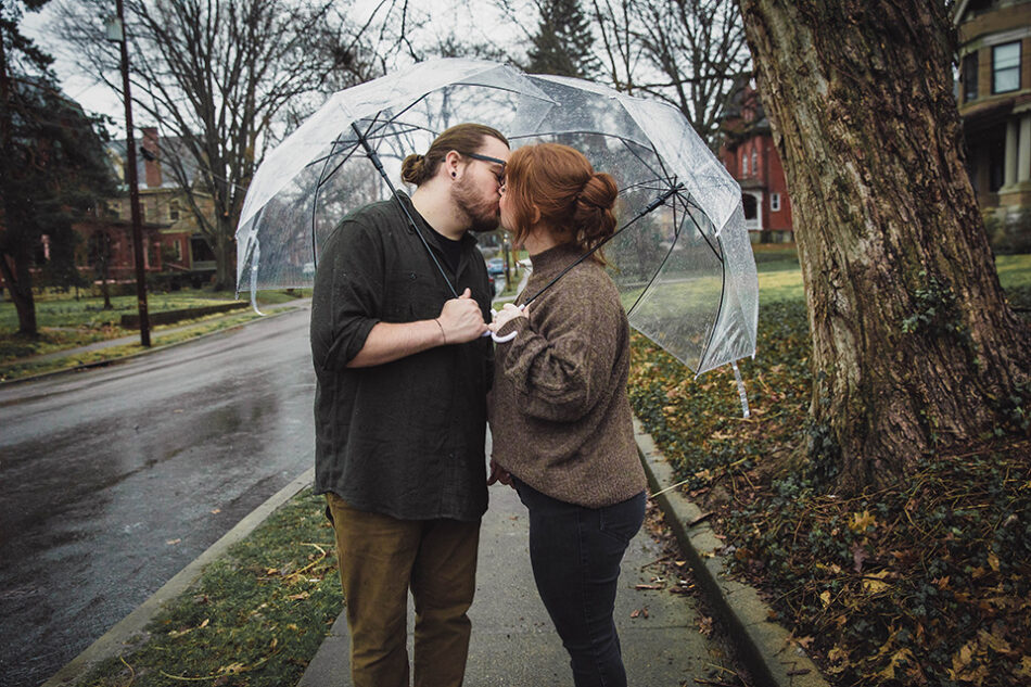 Moody rain-soaked engagement photo in Cincinnati