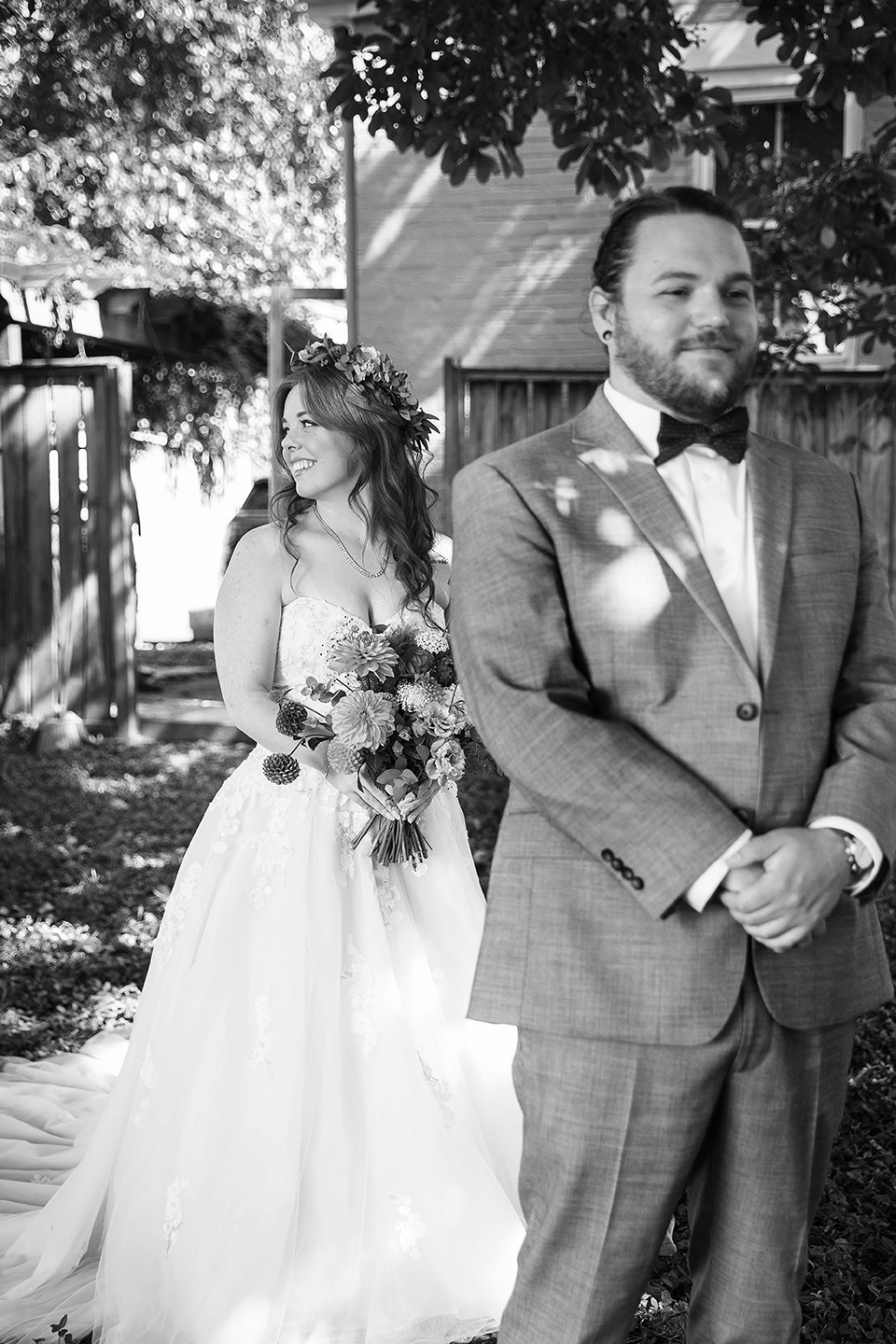 As evening approached, we stepped outside for portraits on the venue’s patio. String lights illuminated the space, creating a soft, romantic glow that perfectly complemented the vintage style of the wedding.